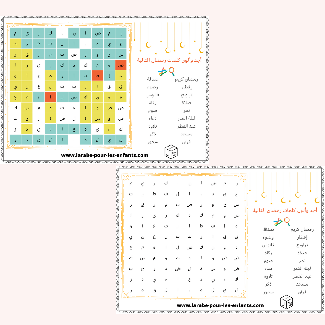 Ce pdf contient une activité sur une page pour la recherche de mots ( relatifs au mois de Ramadan) et une page de solution.