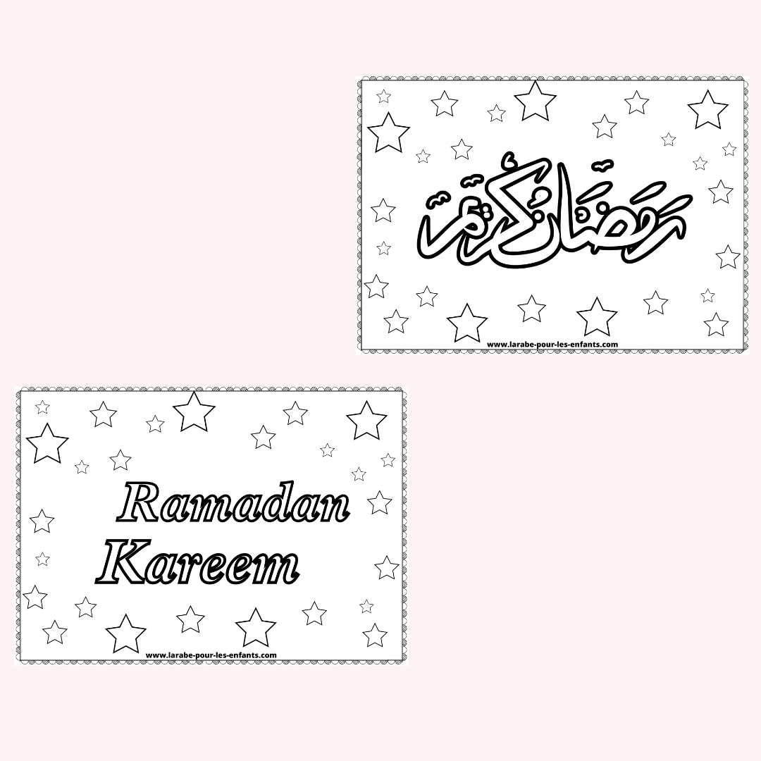 Ce support PDF contient 2 pages pour le collage de motifs étoile et coloriage ramadan kareem en arabe et en français.