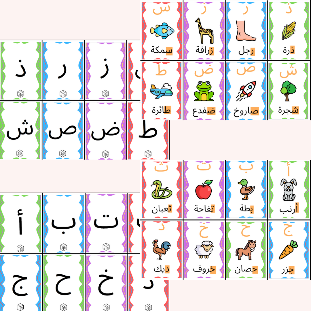 يحتوي الملف على ما تحتاجه لطبع مجموعة من 28 بطاقة مزدوجة الوجهين لتعلم الحروف العربية