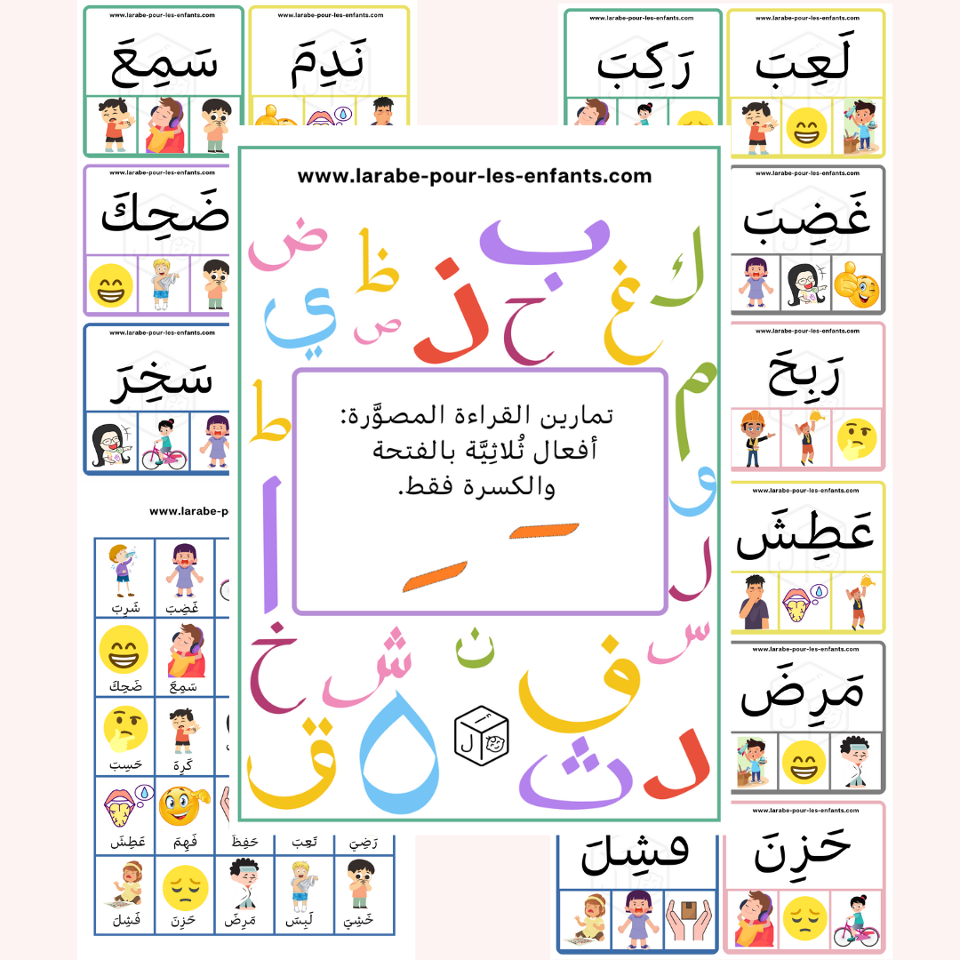 يحتوي هذا الملف على 24 بطاقة  تحتوي على تمارين للقراءة التي تعتمد على الأفعال الثلاثية بالفتحة والكسرة فقط